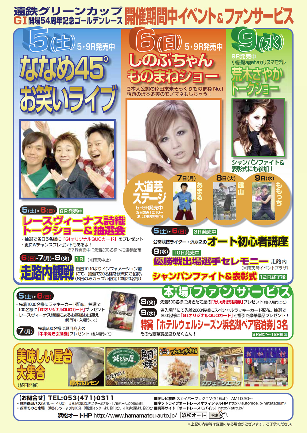> 遠鉄グリーンカップGI開場54周年記念ゴールデンレースイベント情報(浜松・6/5~9)