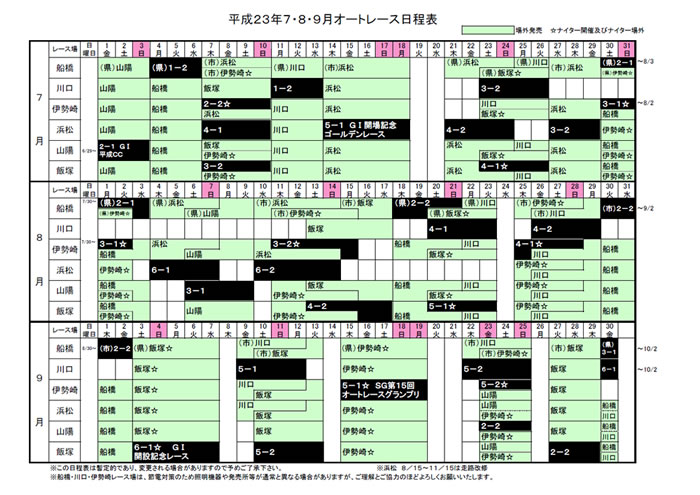 | SG | 第15回オートレースグランプリ【ナイター】 | 伊勢崎 | 平成23年9月15日(木)~9月19日(祝月) | 〃 |