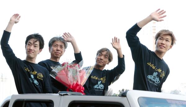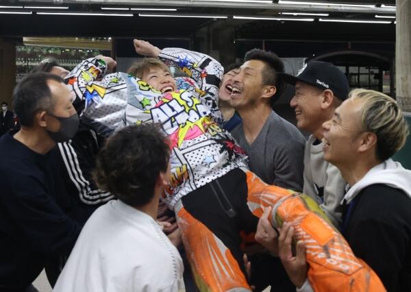 優勝した佐藤励は仲間から胴上げされる