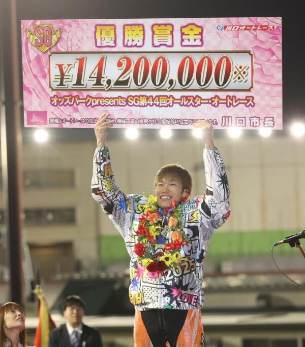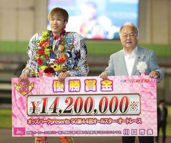 佐藤励(左)は奥ノ木信夫川口市長と賞金ボードを持つ