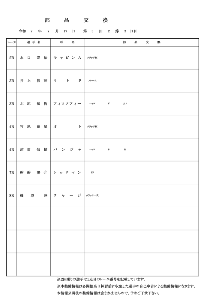 ※本整備情報は各開催当日朝に収集した選手の自己申告による整備情報になります。