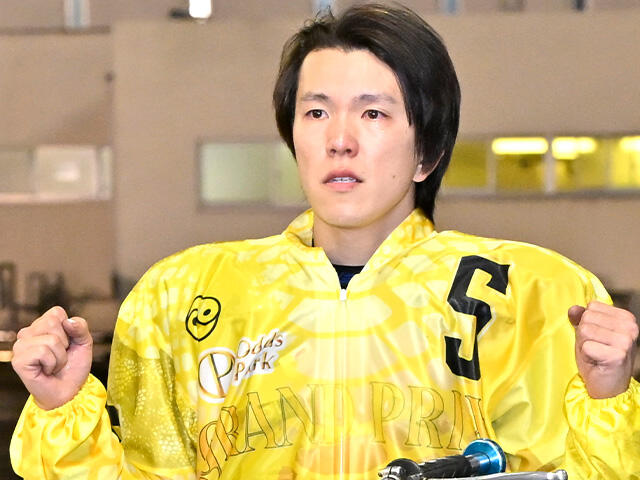 (黒川京介選手との並走は)落ち着いて走ることができて養成所の二車並列を思い出しながら走りました。グランドスラム達成できるって思ったのは?3周目くらい。金子大輔さんが離れてからです。仕上がりは良かったですね。(黒川選手に)うまく走られていたので勝負どころを探していたけど、見つからなかったので(7周回4コーナーから8周回1コーナーにかけて)行ってみた。先頭に立ったらがむしゃらに逃げるだけ。自分を信じて走った。まだ実感はわかないです。夢の中にいるみたいです。グランドスラムはやっとできたって感じ?(期間的には)短いんだと思うんですけど、長かったです。