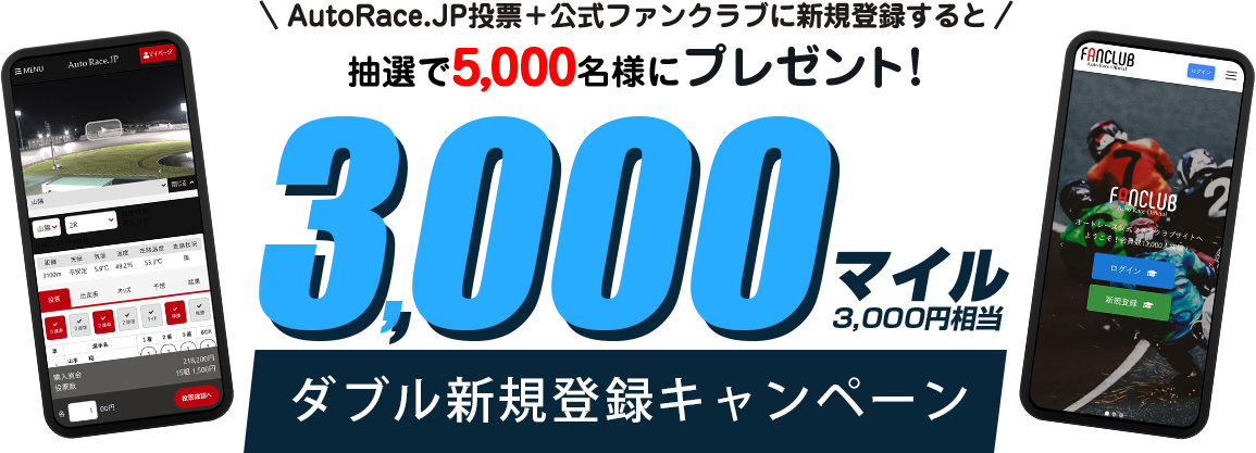 キャンペーン期間[2022/10/25(火)~11/7(月)]に、AutoRace.JP投票と公式ファンクラブの新規登録が完了したお客様に「抽選で5,000名様に3,000マイル(3,000円相当)」をプレゼント!