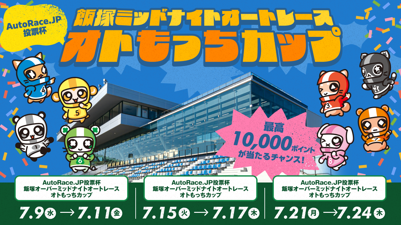 飯塚ミッドナイトAutoRace.JP投票杯オトもっちカップの開催を記念し、抽選で最高10,000ポイントが当たるプレゼントキャンペーンを実施します。