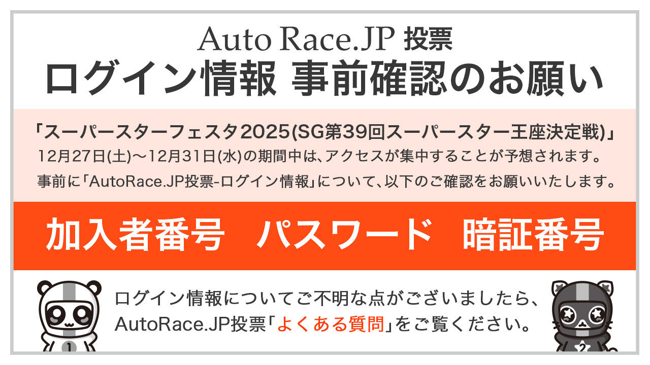 12月27日(土)~12月31日(水)に開催する「スーパースターフェスタ2025 (SG第40回スーパースター王座決定戦)」の期間中は、アクセスが集中することが予想されます。そのため、事前に「AutoRace.JP投票-ログイン情報」の加入者番号・パスワード・暗証番号について、ご確認をお願いいたします。